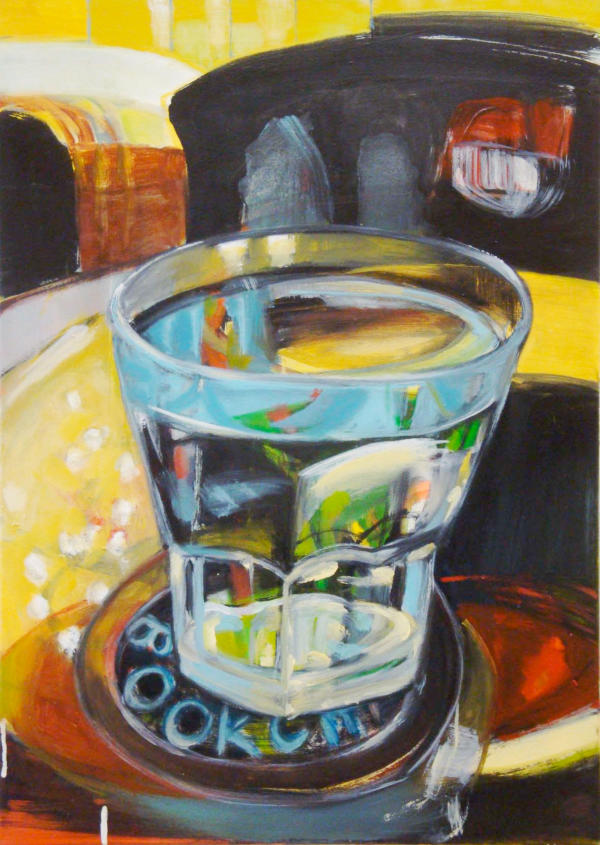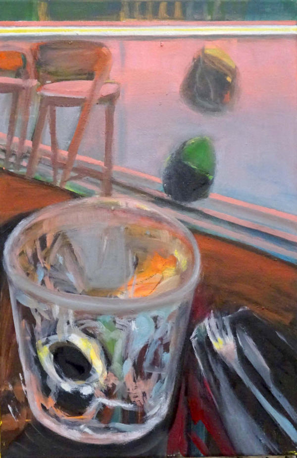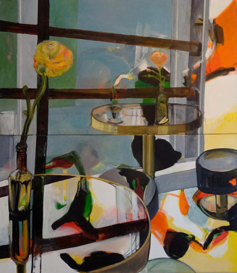 dieses Öl/Acrylbildes diente, das Interieur eines Cafés mit drei hintereinander