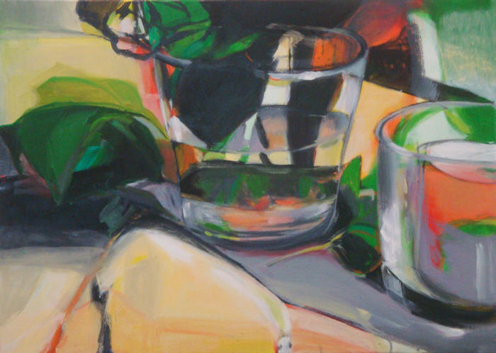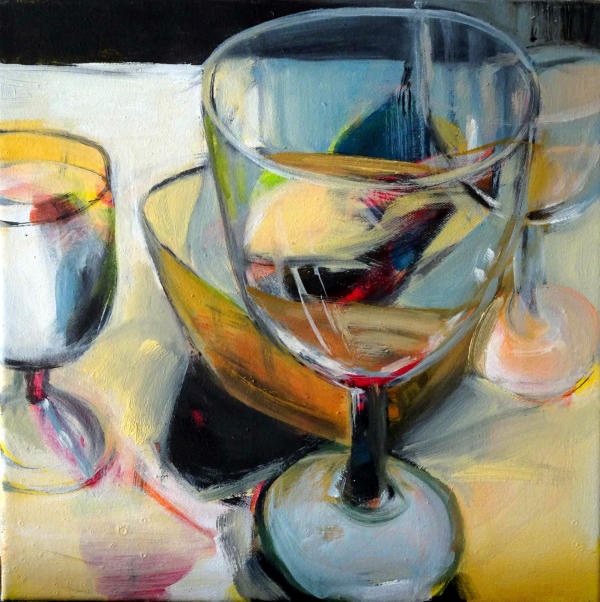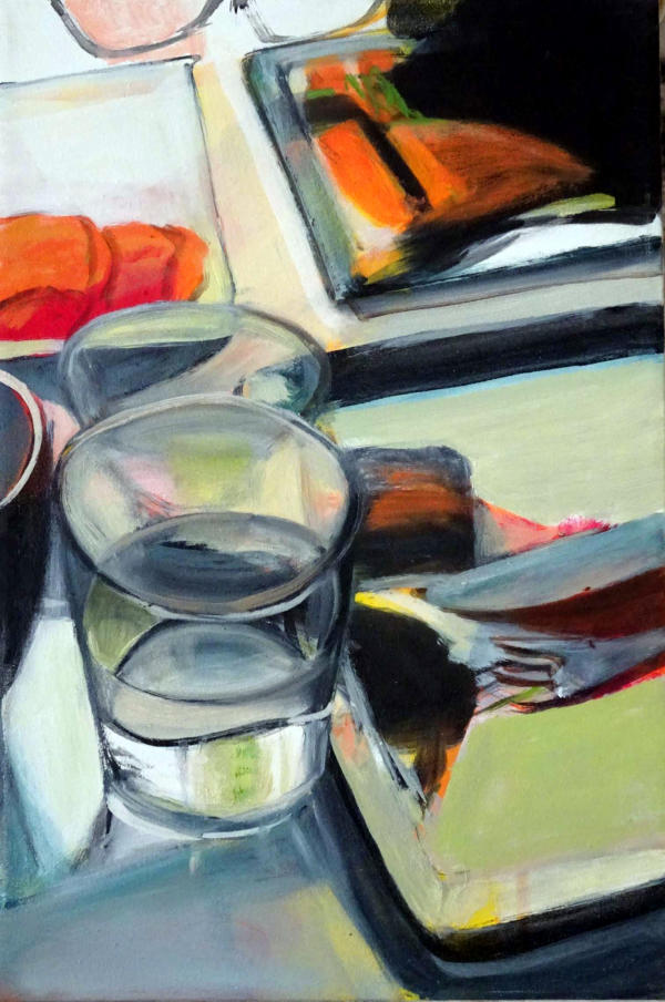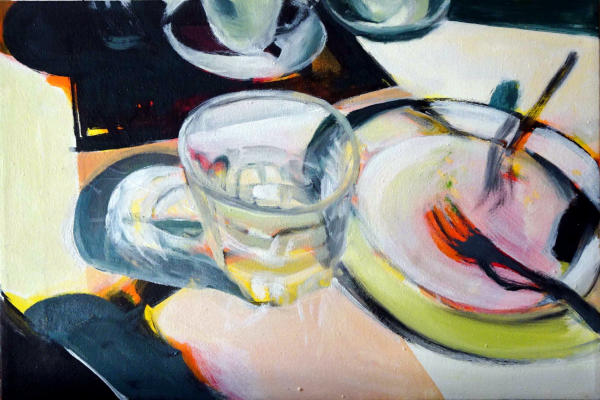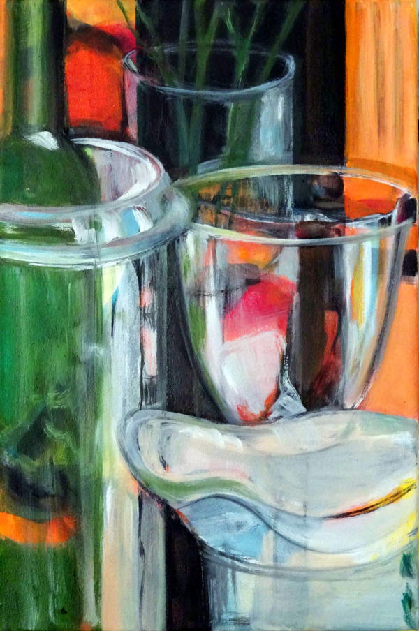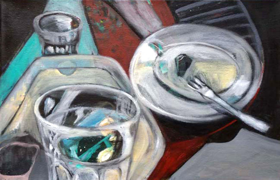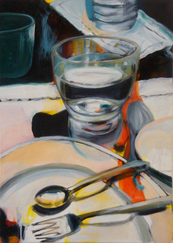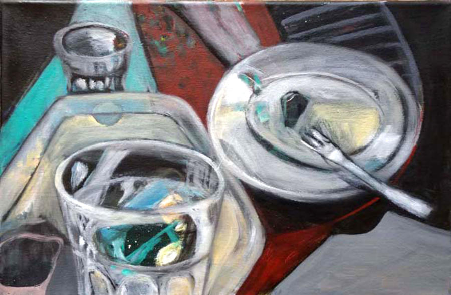 surfaces of the glasses and cutlery mirror each other and melt into the background coloration, making