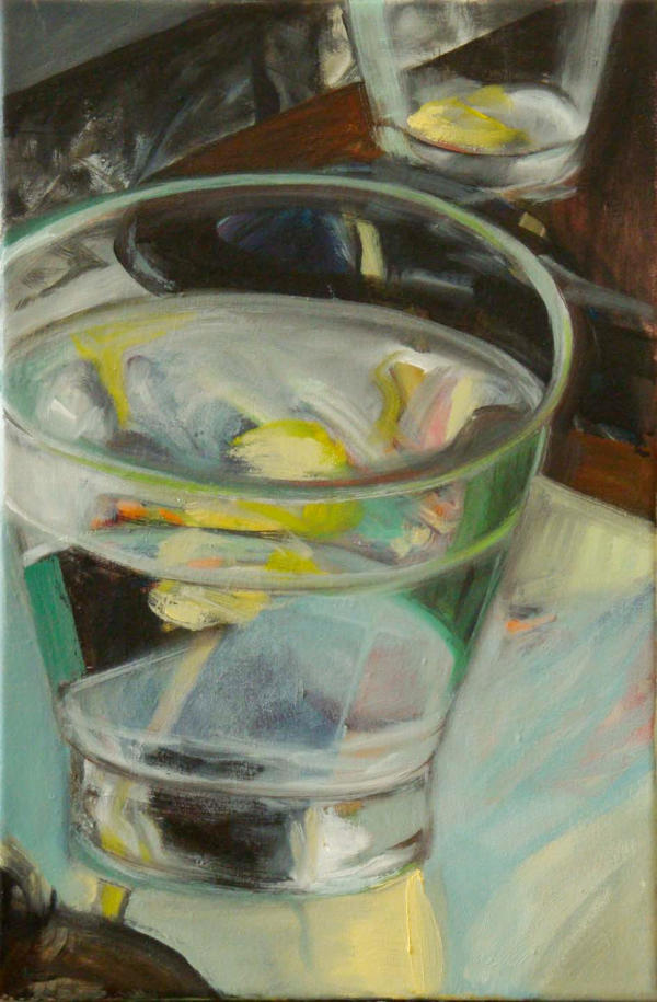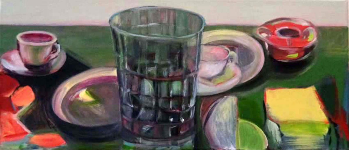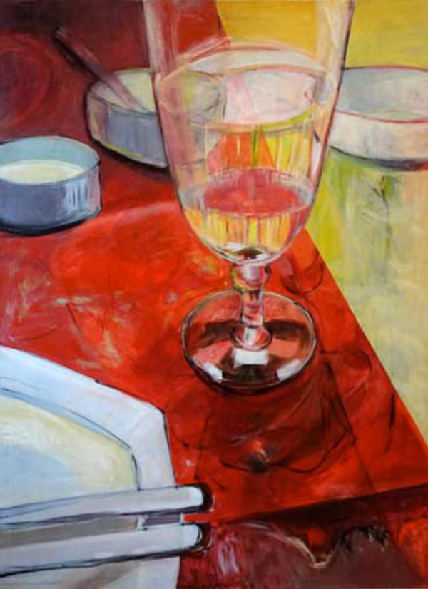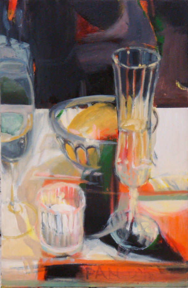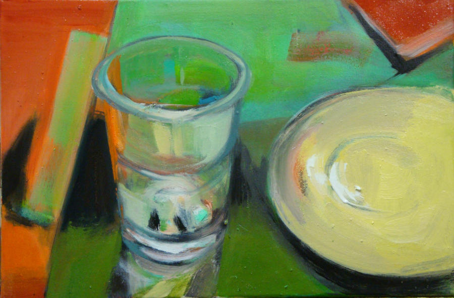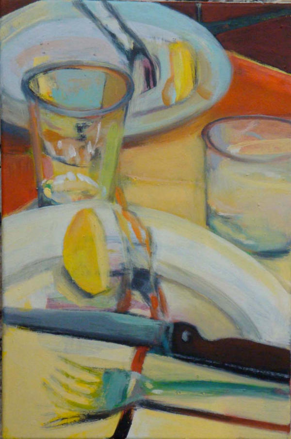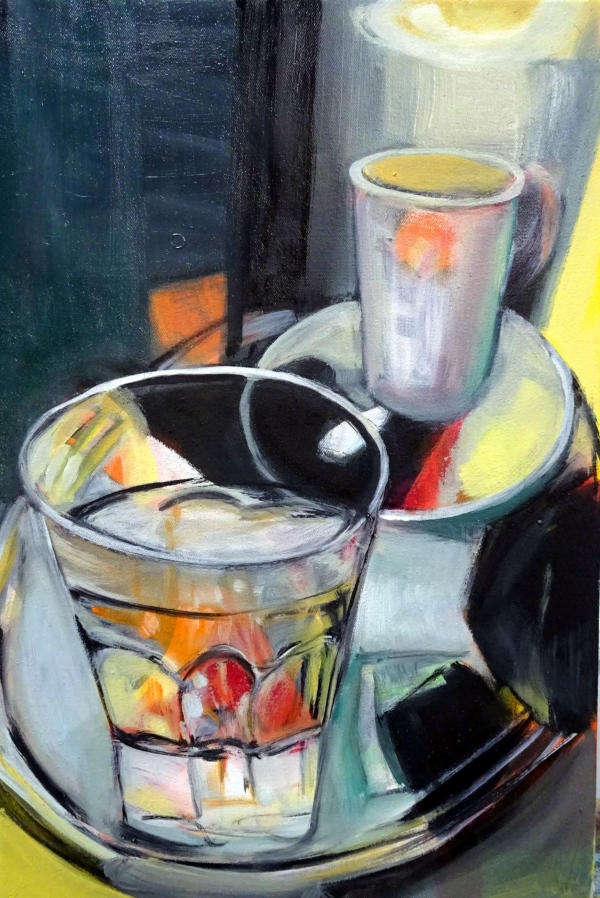 surfaces of the glasses and cutlery mirror each other and melt into the background coloration, making