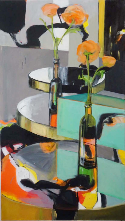 containing a single flower, a ranunculus. All these objects appear several times: three tables, two vases,