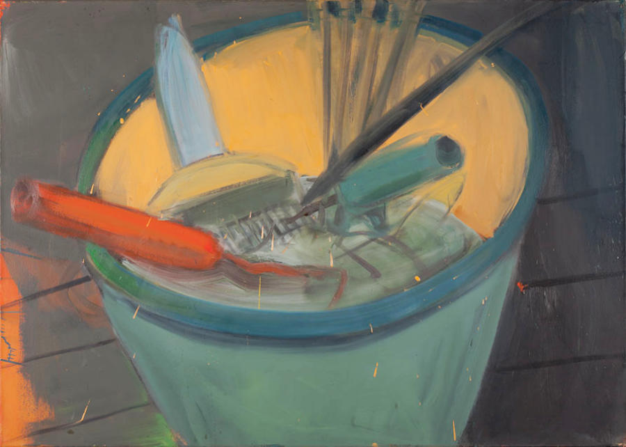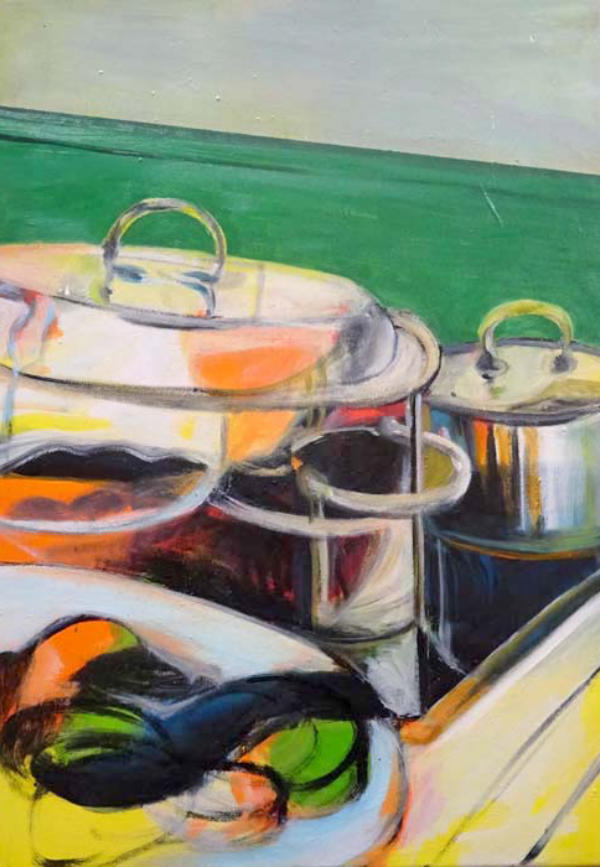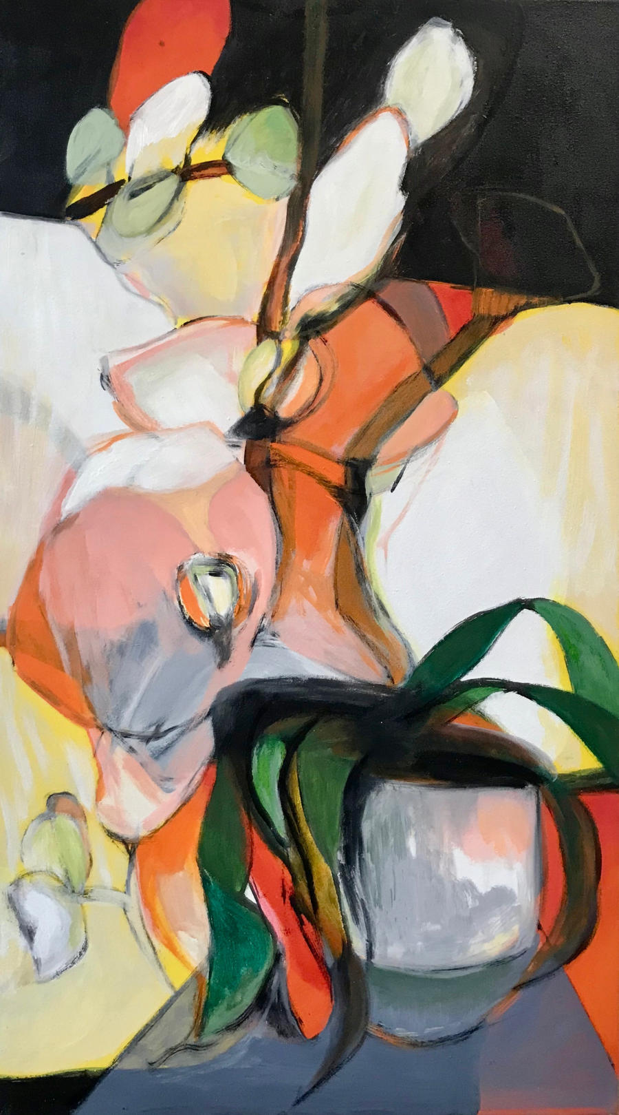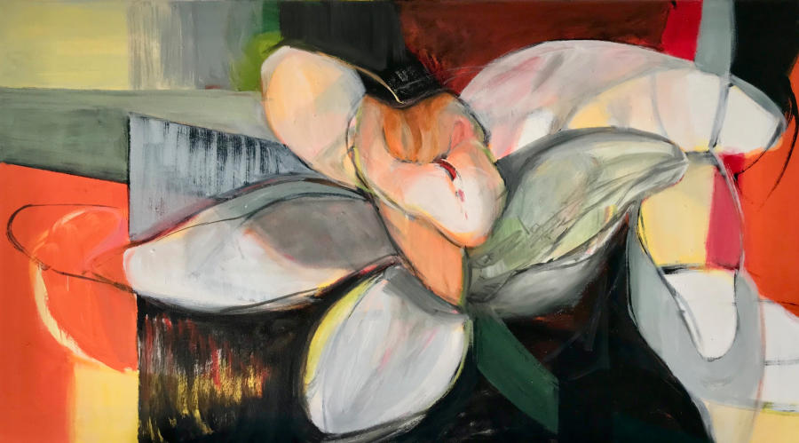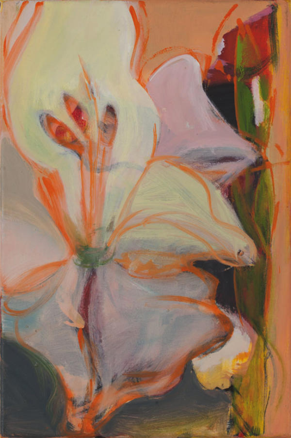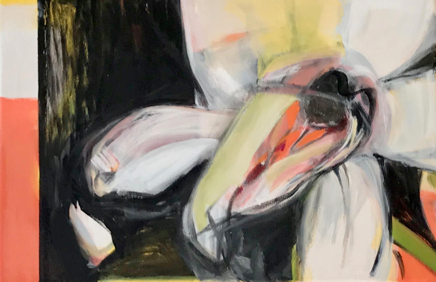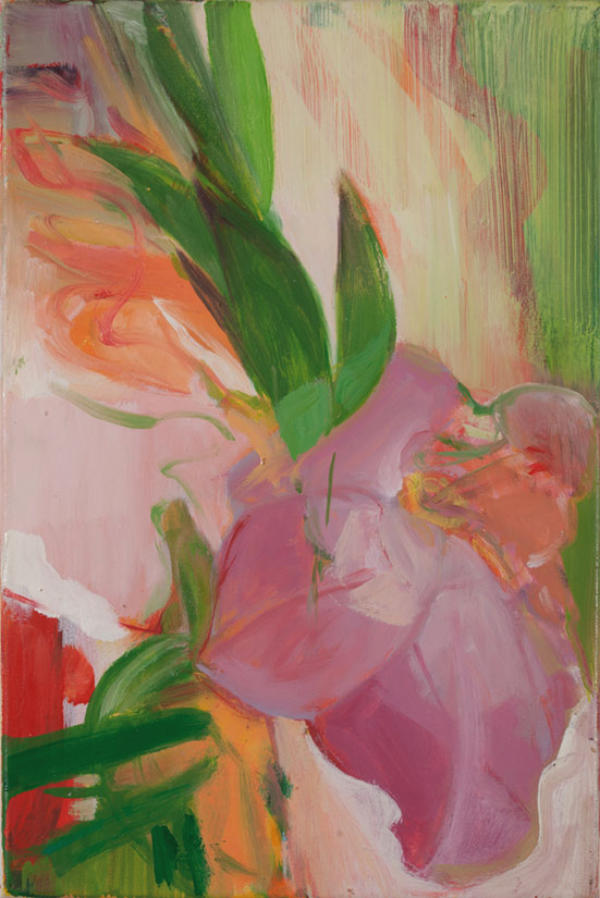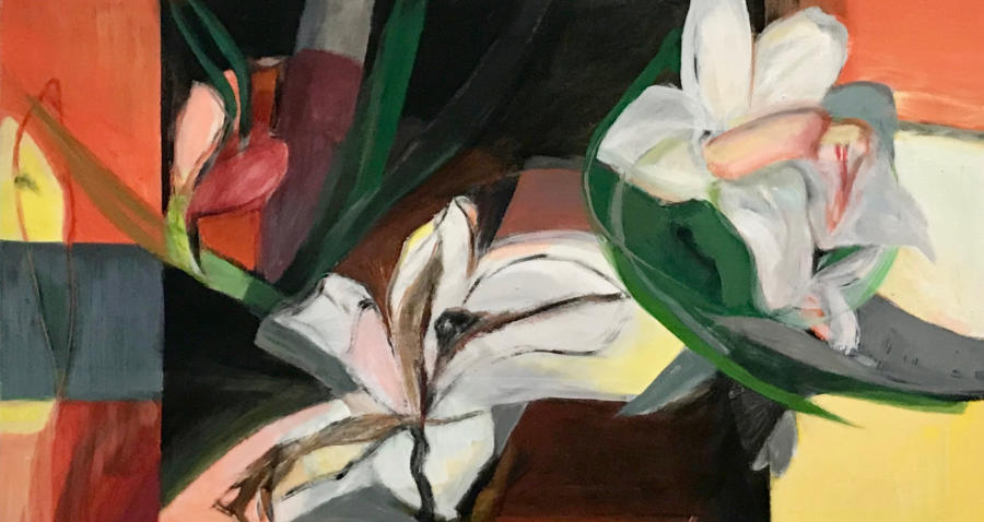 This muted, skimmed-milky blue green combines in Carin E. Stoller’s painting with the flowery-fleshy hue