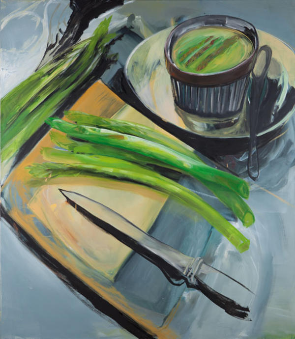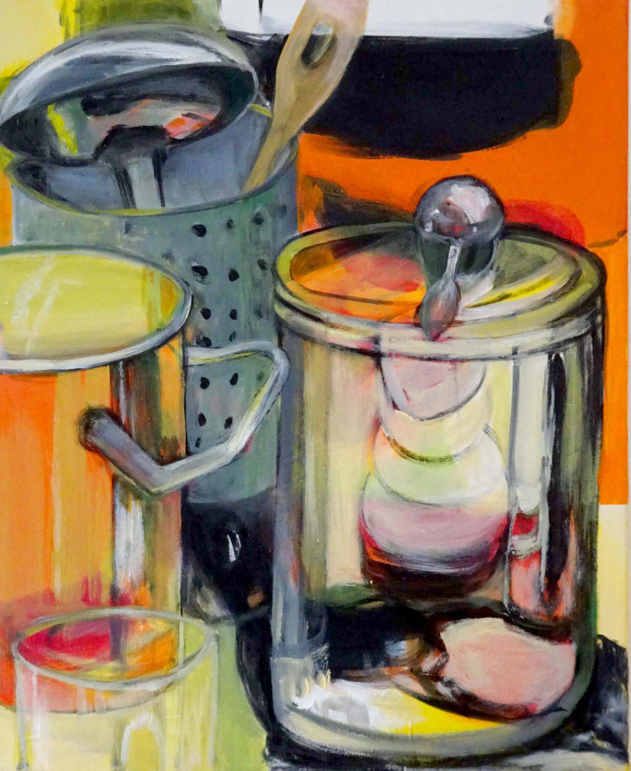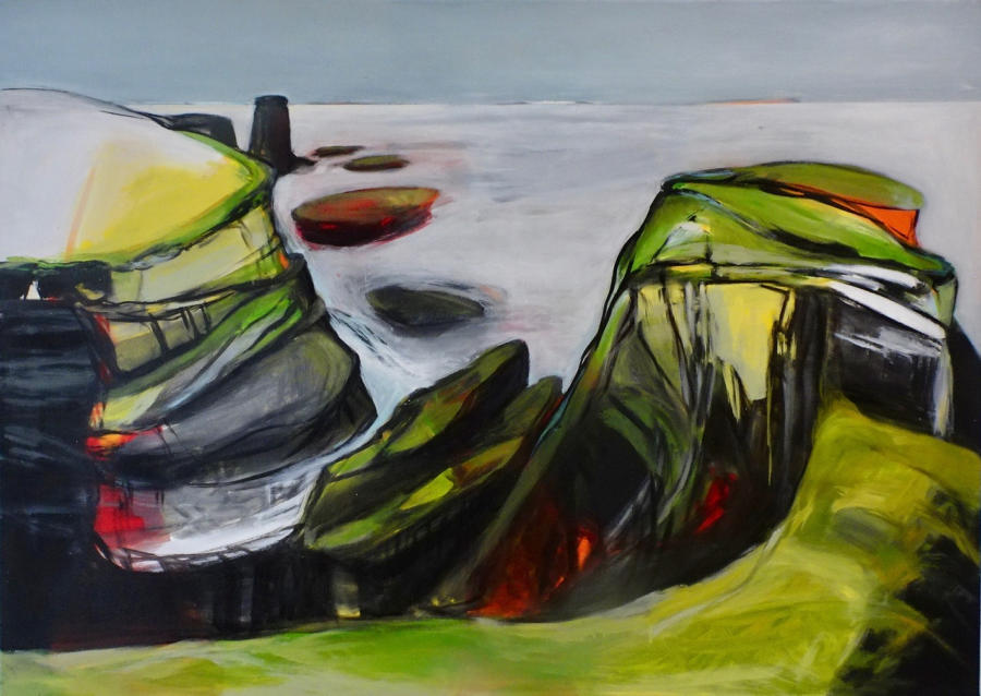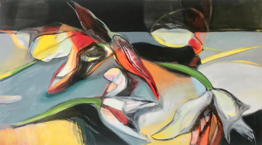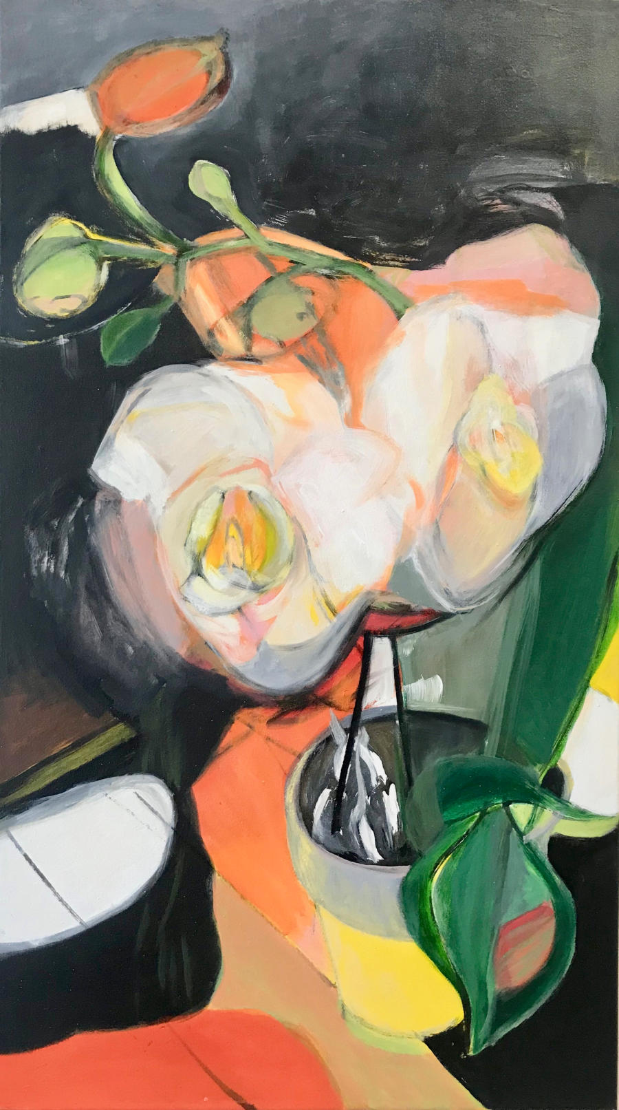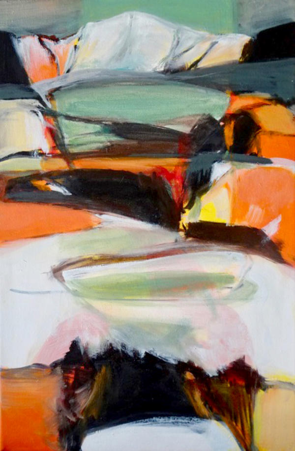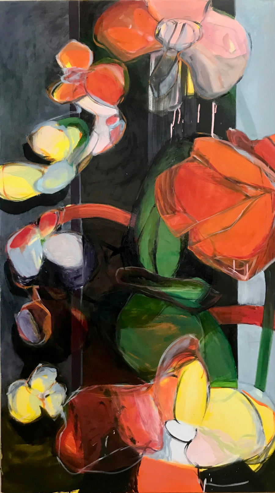 This muted, skimmed-milky blue green combines in Carin E. Stoller’s painting with the flowery-fleshy hue