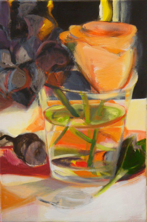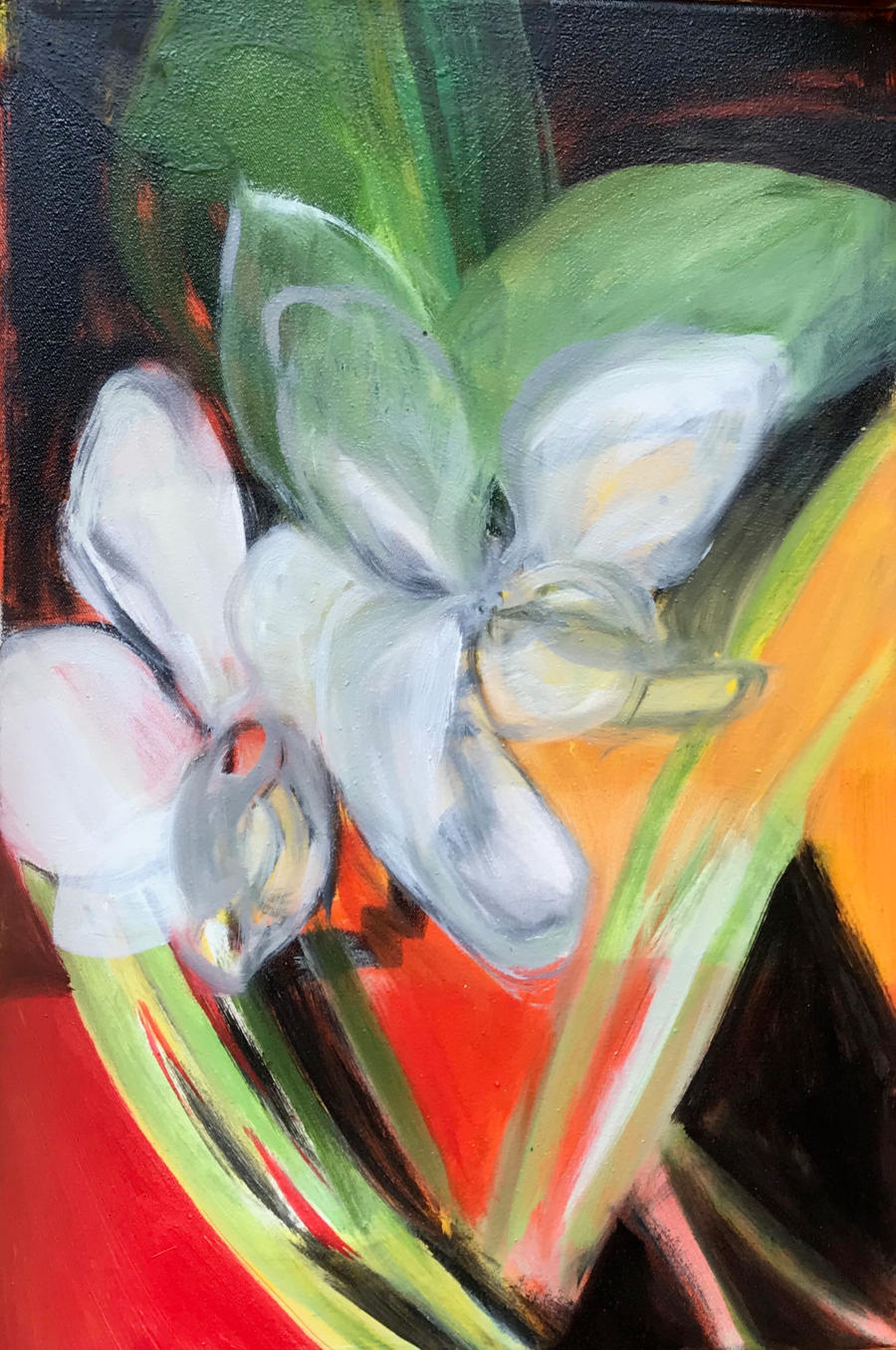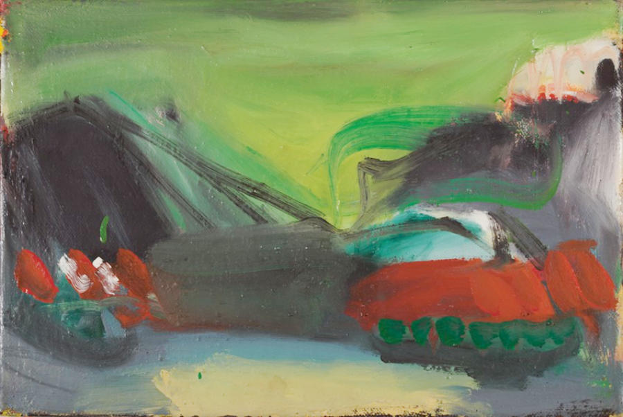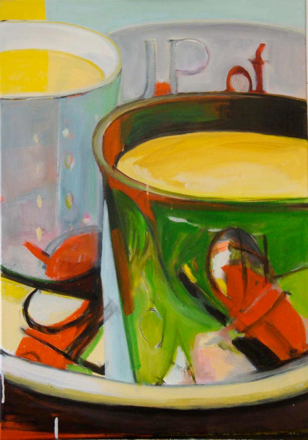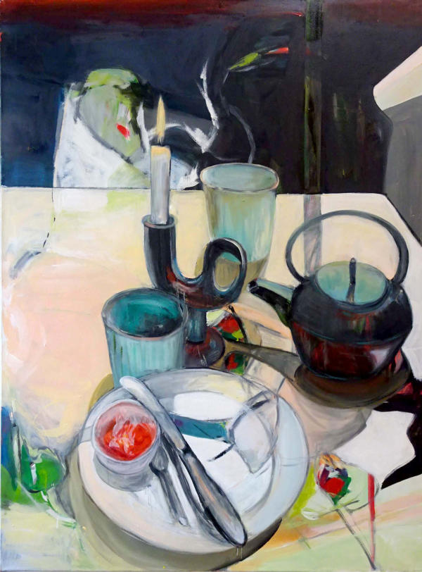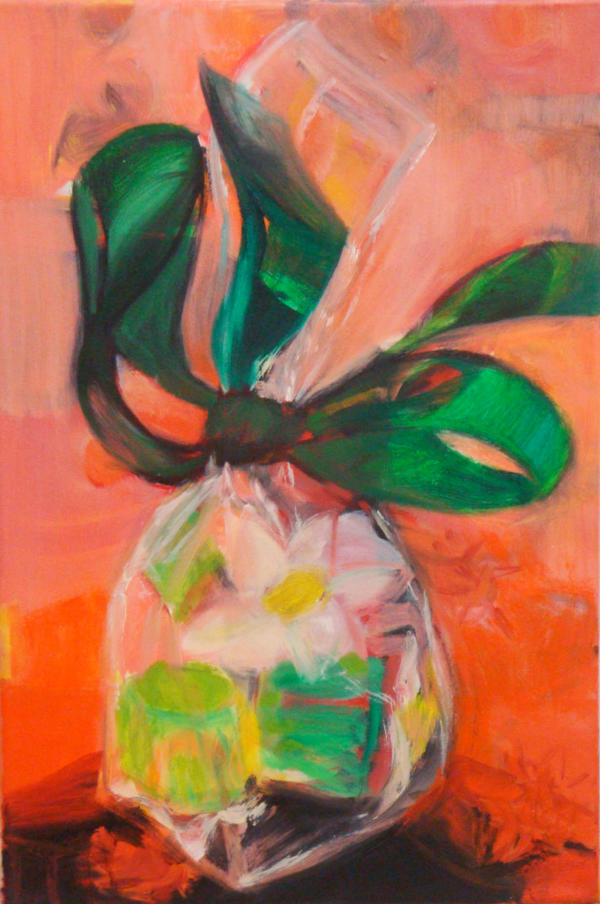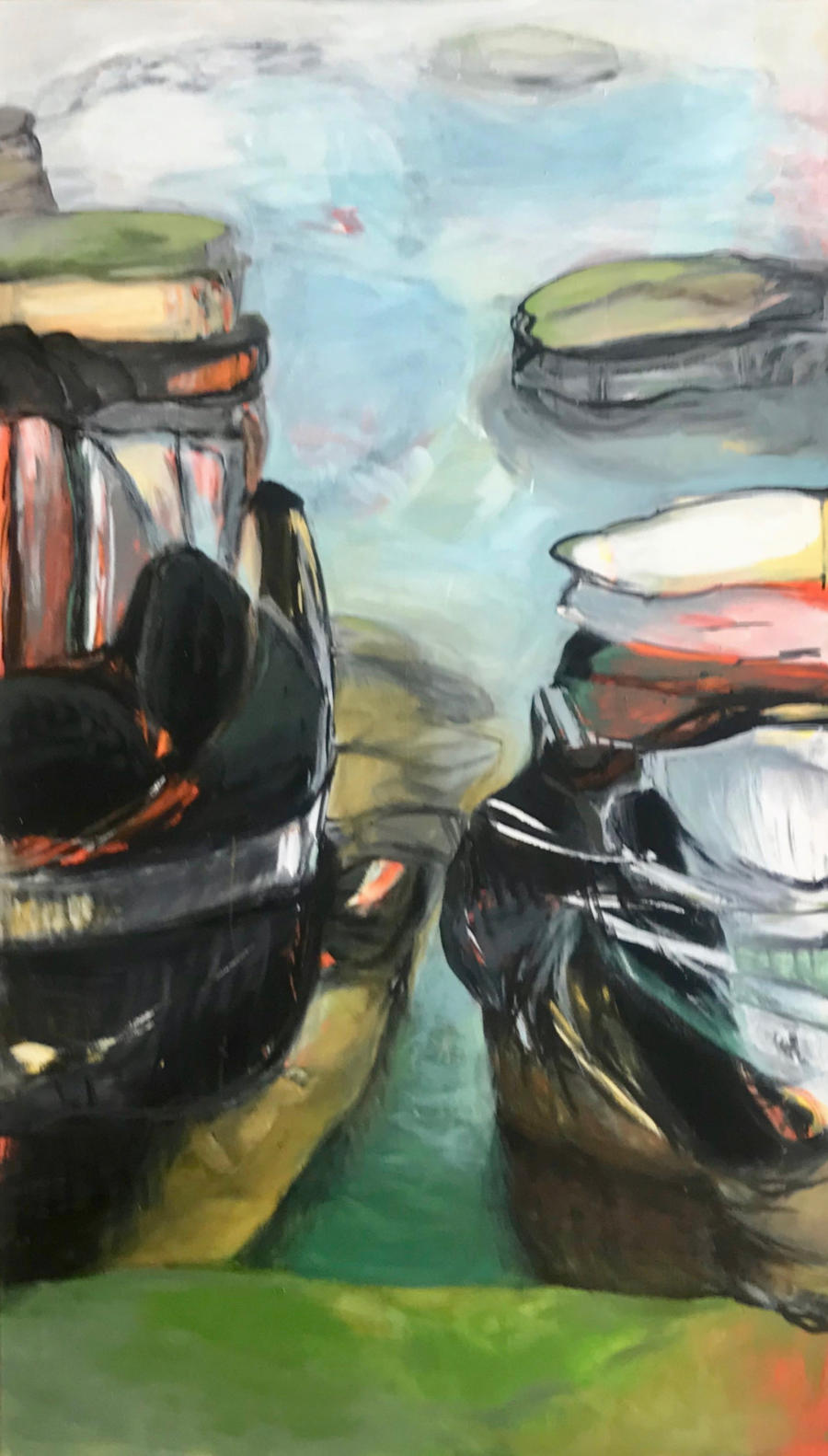 This muted, skimmed-milky blue green combines in Carin E. Stoller’s painting with the flowery-fleshy hue