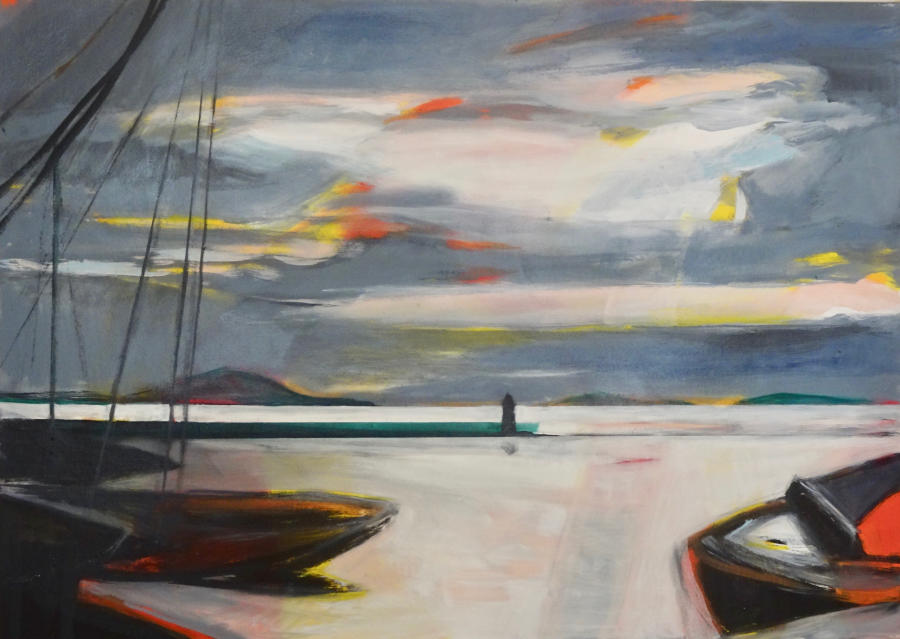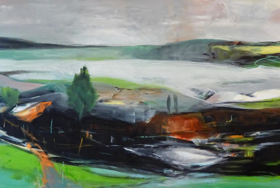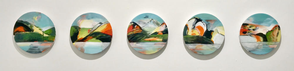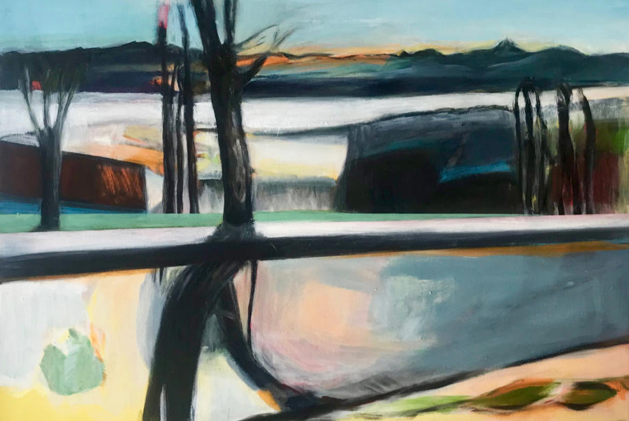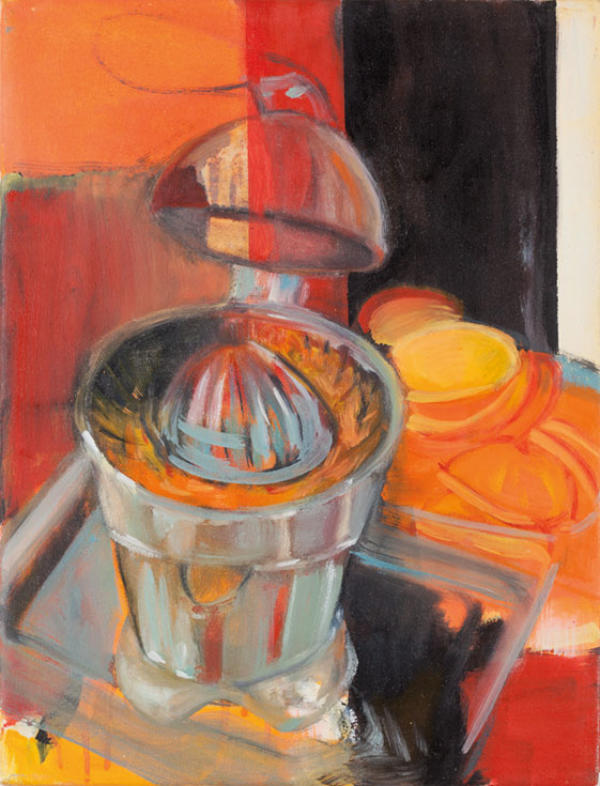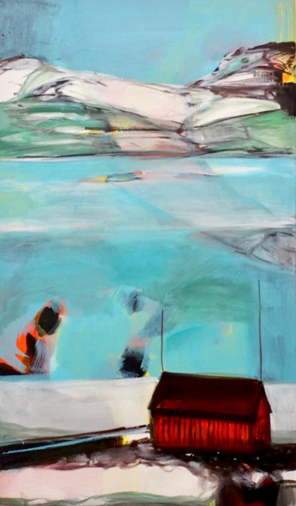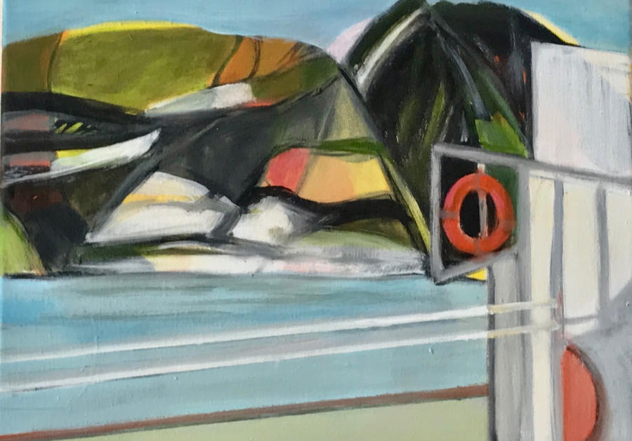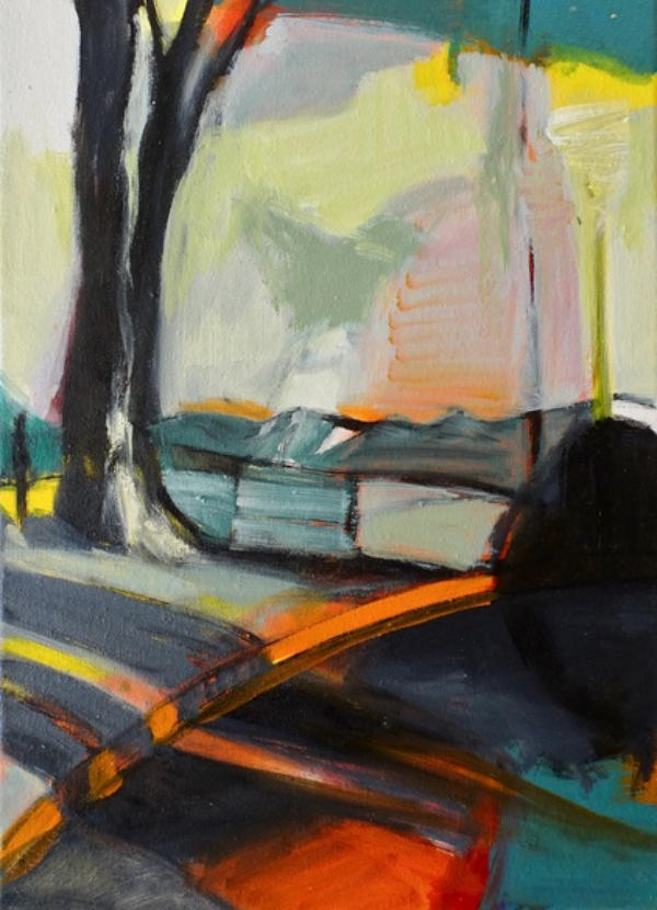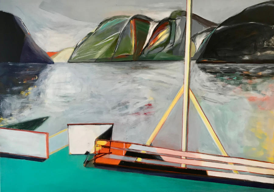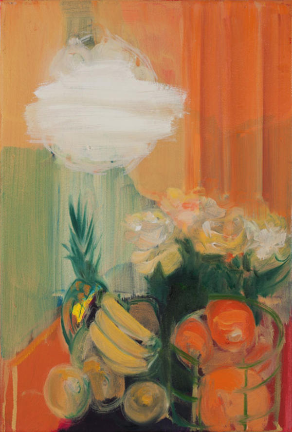 This muted, skimmed-milky blue green combines in Carin E. Stoller’s painting with the flowery-fleshy hue