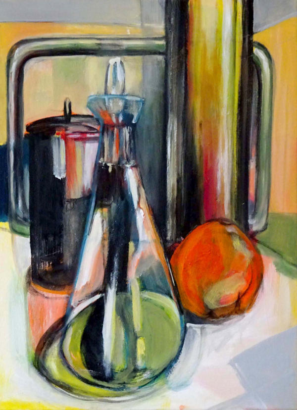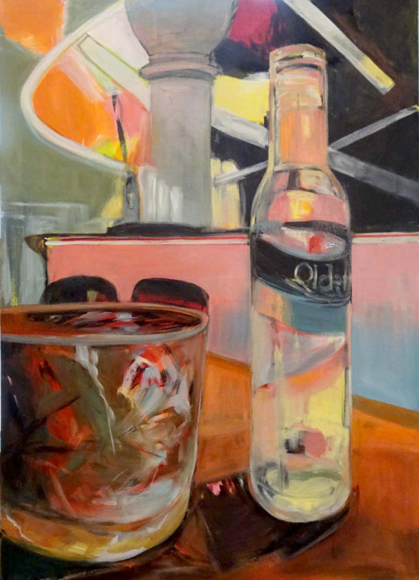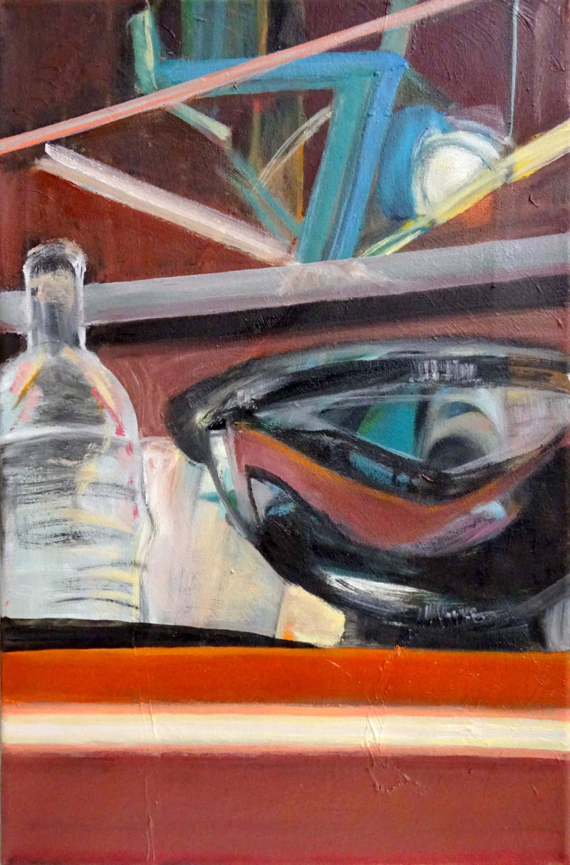 Flasche, Tisch, Wand und Boden mit den Abstrakta Farbe, Fleck und Duktus,